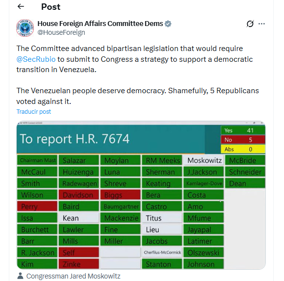 A través de una publicación en la red social X, el Comité explicó que la legislación requerirá que el secretario de Estado —cargo ocupado por Marco Rubio— entregue al Congreso un informe con ese plan, en el que se incluyan elementos como la promoción de libertades políticas y formas de apoyo al pueblo venezolano.