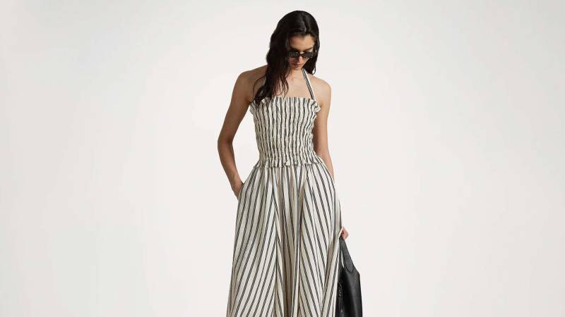 Swift lució un vestido de Polo Ralph Lauren a rayas blancas y negras, confeccionado en mezcla de seda de morera y nailon, con corpiño fruncido estilo peplum y falda evasé, un look que combinó romanticismo moderno y elegancia atemporal. Completó su outfit con sandalias de tacón bajo de Louis Vuitton, delicada joyería y un reloj Cartier con diamantes.